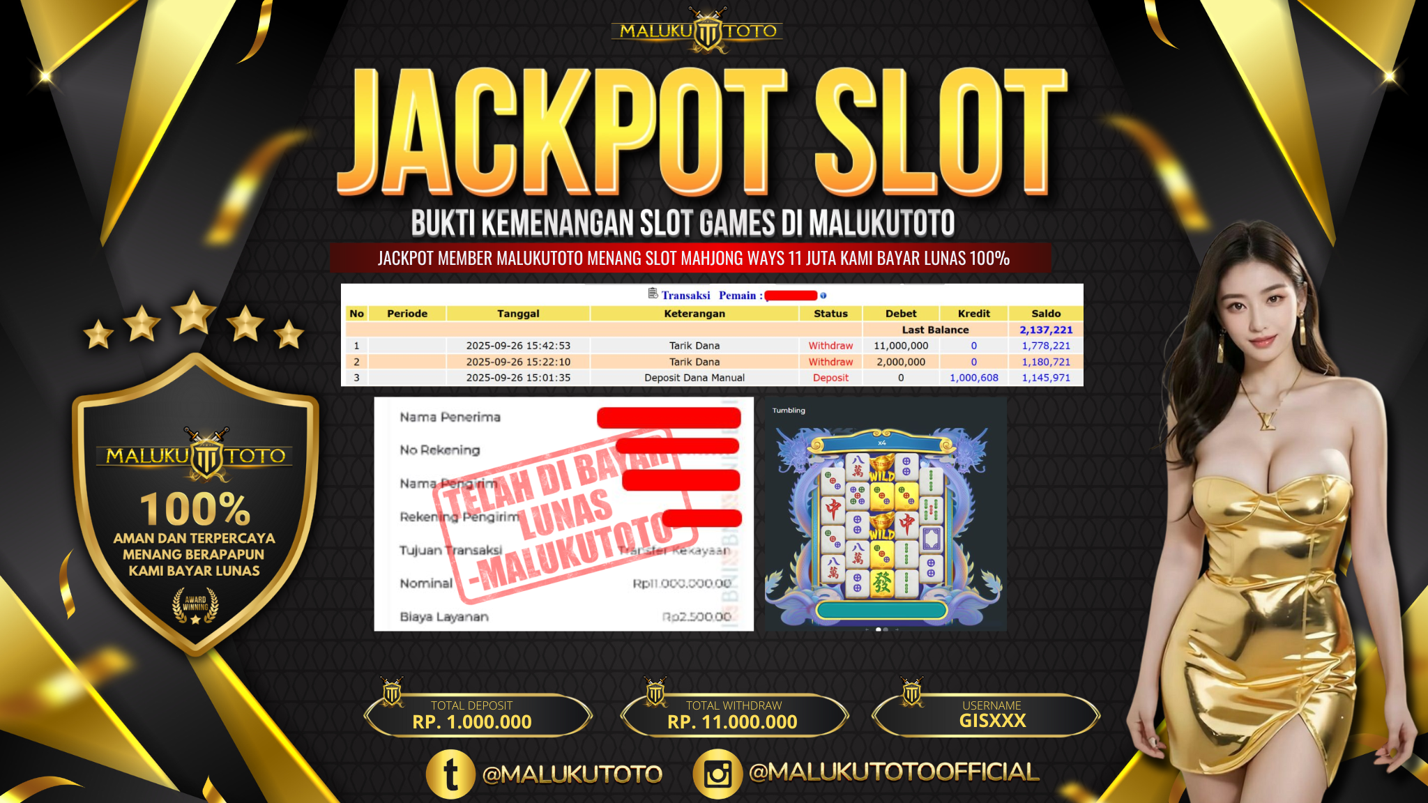 Selamat kepada User id : GIS*** Telah berhasil mendapatkan kemenangan besar pada permainan SLOT MAJHONG WAYS 3 kemenangan Sebesar Rp.11,000,000, Setelah mengisi formulir withdraw dengan kurung waktu hanya 3 – 5 menit pihak malukutoto sudah melakukan transfer kepada pemilik Userid dan dana sudah dapat di cairkan oleh pemenang. Bukti pembayaran yang kami berikan merupakan bukti pembayaran yang SAH / VALID yang langung di dapatkan melaui tanda transfer transaksi dari Bank yang di tuju.