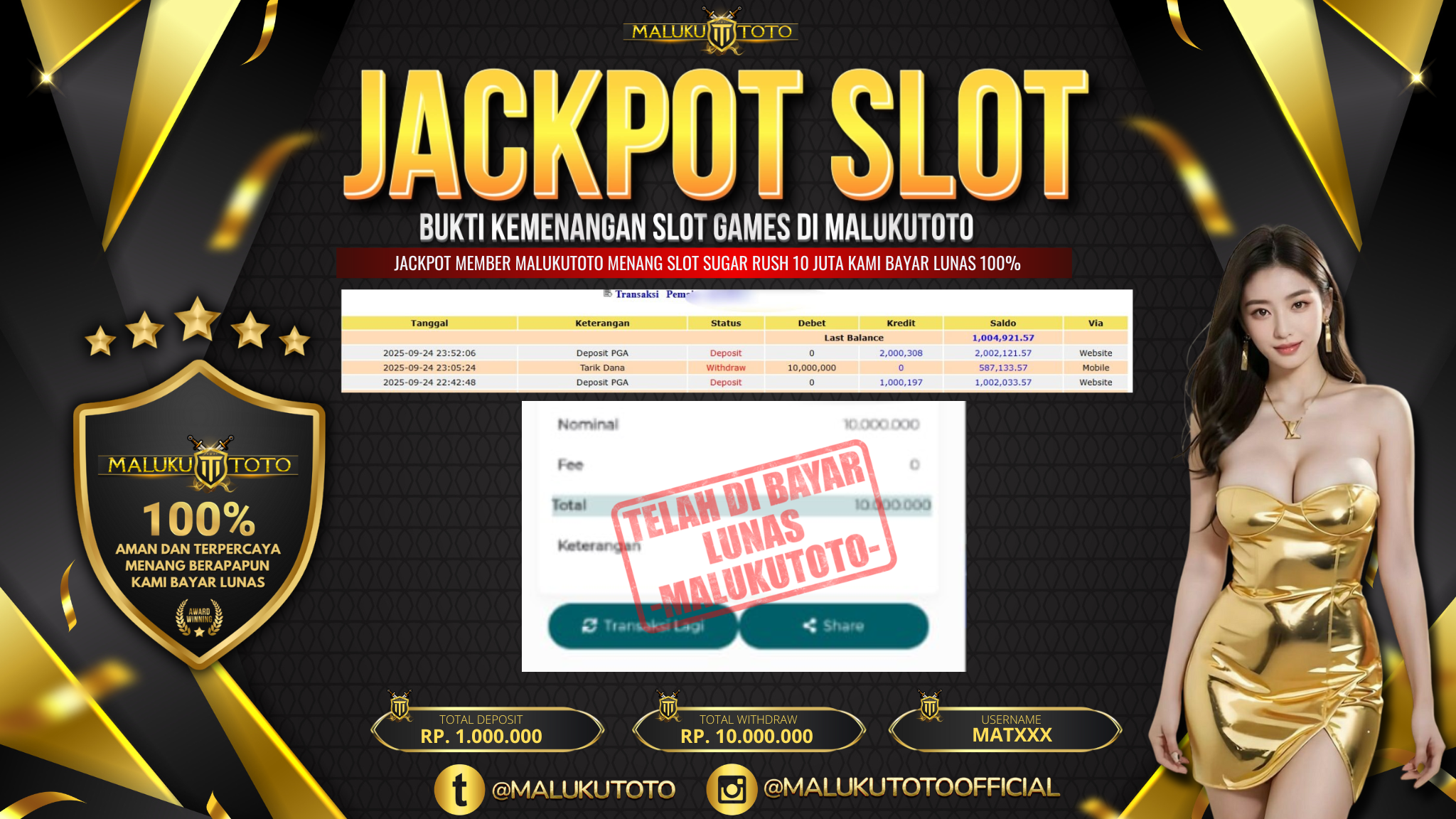 Selamat kepada User id : MAT*** Telah berhasil mendapatkan kemenangan besar pada permainan SLOT SUGAR RUSH kemenangan Sebesar Rp.10,000,000, Setelah mengisi formulir withdraw dengan kurung waktu hanya 3 – 5 menit pihak malukutoto sudah melakukan transfer kepada pemilik Userid dan dana sudah dapat di cairkan oleh pemenang. Bukti pembayaran yang kami berikan merupakan bukti pembayaran yang SAH / VALID yang langung di dapatkan melaui tanda transfer transaksi dari Bank yang di tuju.