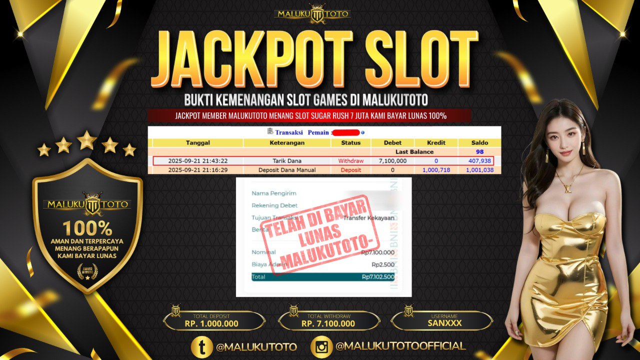 Selamat kepada User id : SAN*** Telah berhasil mendapatkan kemenangan besar pada permainan SUGAR RUSH kemenangan Sebesar Rp.7.100.000, Setelah mengisi formulir withdraw dengan kurung waktu hanya 3 – 5 menit pihak malukutoto sudah melakukan transfer kepada pemilik Userid dan dana sudah dapat di cairkan oleh pemenang. Bukti pembayaran yang kami berikan merupakan bukti pembayaran yang SAH / VALID yang langung di dapatkan melaui tanda transfer transaksi dari Bank yang di tuju.