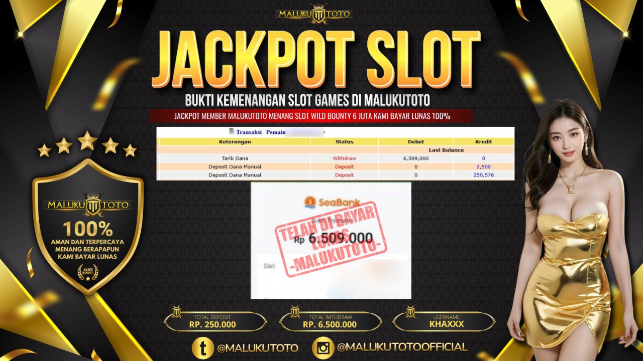 Selamat kepada User id : KHA*** Telah berhasil mendapatkan kemenangan besar pada permainan SLOT WILD BOUNTY kemenangan Sebesar Rp.6,500,000, Setelah mengisi formulir withdraw dengan kurung waktu hanya 3 – 5 menit pihak malukutoto sudah melakukan transfer kepada pemilik Userid dan dana sudah dapat di cairkan oleh pemenang. Bukti pembayaran yang kami berikan merupakan bukti pembayaran yang SAH / VALID yang langung di dapatkan melaui tanda transfer transaksi dari Bank yang di tuju.